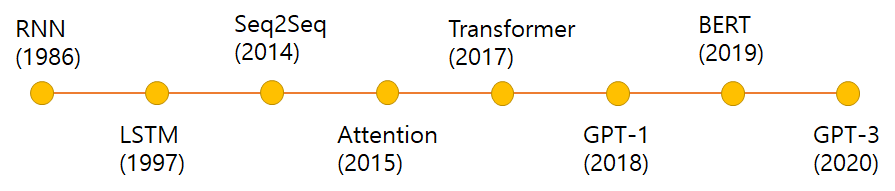 그 동안 ML분야에선 vision과 관련된 분야들이 눈에 띄는 발전을 이루어 온 것에 비해 NLP 분야의 발전은 더딘 편이었다. 그러나 최근 들어 좋은 성능을 보이는 다양한 모델들이 나오면서 NLP 분야에서도 급진적인 발전이 이루어지고 있다. 이러한 NLP의 발전을 이끈 모델들의 변천사는 대략 아래와 같다. 오늘 리뷰할 Transformer 논문은 2017년에 발표된 것이다.