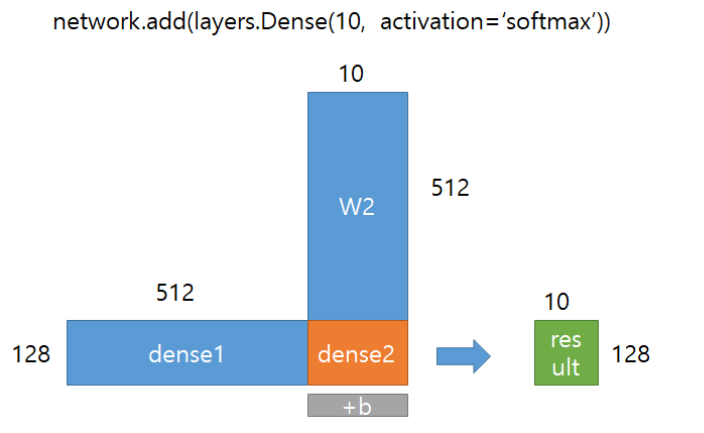 - input 행렬의 열 갯수는 하나의 sample data가 몇 차원 벡터로 나타내지는지를 가리킨다. 코드 첫 번째 줄에서 input_shape=(28*28,)로 나타내므로 input 행렬의 열 갯수는 784가 된다.