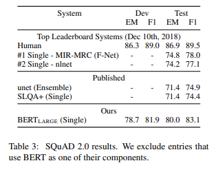 - SQuAD v2.0은 v1.1의 확장판으로 paragraph에 short answer이 없는 경우도 포함시켜서 좀 더 realistic한 학습을 할 수 있다.