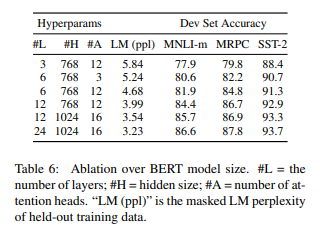 - 특이점은 MRPC와 같이 small dataset에서도 large model이 더 좋은 accuracy를 보인다는 것이다(보통 small dataset의 경우 모델 크기가 커지면 오버피팅으로 인해 accuracy가 저하되는 경우가 많은 것을 고려하면 이례적이다)