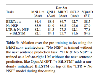 - NSP를 제거한 모델은 QNLI, MNLI, SQuAD task에서 성능이 크게 저하