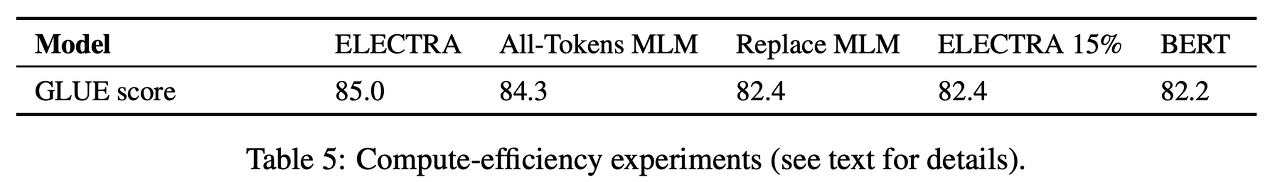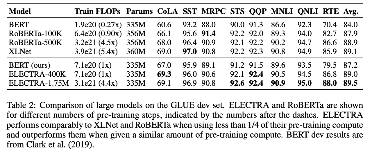 결과적으로 ELECTRA는 모델 크기, 데이터, 컴퓨팅 리소스가 동일한 조건에서 기존 BERT의 성능을 능가하였고, small model에서 하나의 GPU로 4일만 학습한 모델로 계산량이 30배나 많은 GPT를 능가하였다.(GLEU score) Large model 역시 RoBBERTa나 XLNet 대비 더 적은 파라미터 수와 1/4의 계산량으로 비슷한 성능에 도달하였다. 즉, RTD task는 기존의 MLM task보다 parameter-efficient하고 compute-efficient한 pre-training task라는 점을 주장한다.