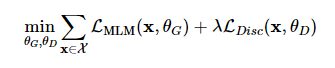 최종적으로 ELECTRA는 대용량 코퍼스 χ에 대해 G loss와 D loss의 합을 최소화하도록 학습시킨다. 이 때, λ는 50을 사용했으며, 이 파라미터는 binary classification인 D loss와 30000 클래스 분류인 G loss의 스케일을 맞추는 역할을 한다. G의 sampling 과정이 있어서 D loss는 G로 역전파되지 않고, 위 구조로 pre-training을 마친 뒤 G는 버리고 D만 취해서 downstream task로 fine-tuning을 진행한다.