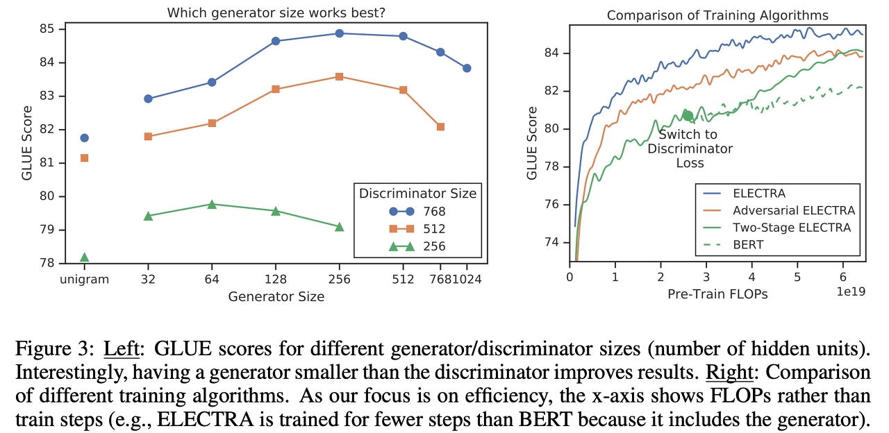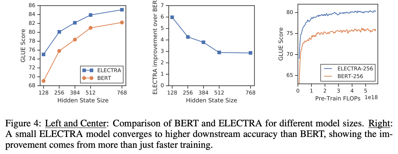 히든 레이어 크기가 작아질수록 BERT와 ELECTRA의 성능 차이가 커지는 것을 볼 수 있다. BERT에 비해 ELECTRA는 모델이 작아도 빠르게 수렴한다.