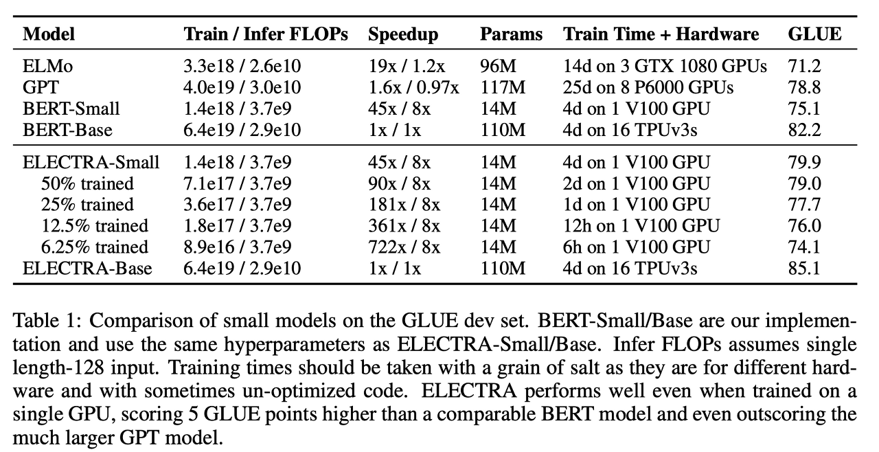 pre-training의 효율이 얼마나 증대되는 것인지 검증하기 위해 하나의 GPU로도 학습할 수 있는 수준의 작은 모델을 만들어 실험을 진행하였다. ELECTRA-Small은 같은 조건을 가진 BERT-Small보다 5 point 높은 성능, 훨씬 큰 모델인 GPT보다 좋은 성능을 냈다. 또한 학습에 대한 수렴 속도가 빨랐다. 하나의 GPU로 6시간 학습시킨 모델이 4일간 fully-trained시킨 BERT-Small과 비슷한 성능을 보였다. ELECTRA-Base는 성능면에서 BERT-Base와 BERT-Large를 능가하였다.