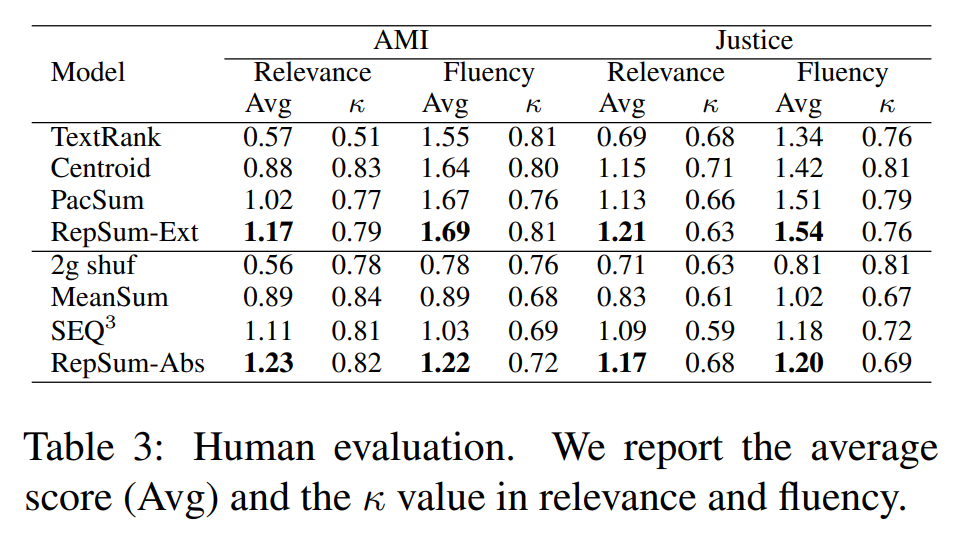 여기서의 평가기준은 relevance와 fluency다. 즉, 생성된 요약문이 얼마나 원문과 유관하고 유창한지(자연스러운지)를 보는 것이다. 각 데이터셋마다 100개의 샘플을 선정하여 6명의 대학원생 평가자들이 평가를 진행했다.