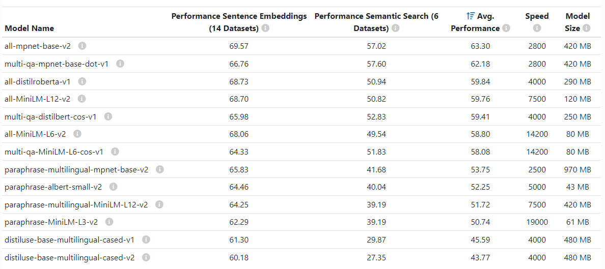 위와 같이 model 파라미터를 통해 문장 임베딩 모델을 선택할 수 있다. 사용할 수 있는 여러 모델들이 있는데 이와 관련해서는 이곳을 참고하면 된다. 링크를 통해 접속하면 아래와 같이 사용할 수 있는 여러 sentence embedding model들이 나온다.