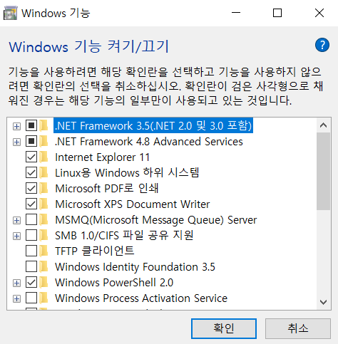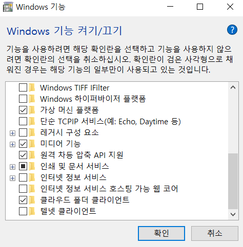 윈도우 우측하단에 검색창에 "windows 기능"이라고 치고 들어가면 아래와 같은 창이 뜬다.