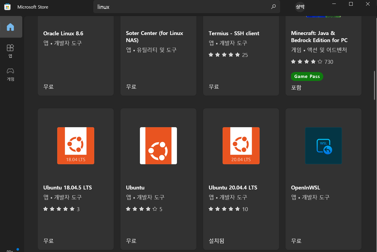다음으로 Microsoft Store에 들어가서 Linux라고 검색한 뒤 Ubuntu를 설치해주면 된다.