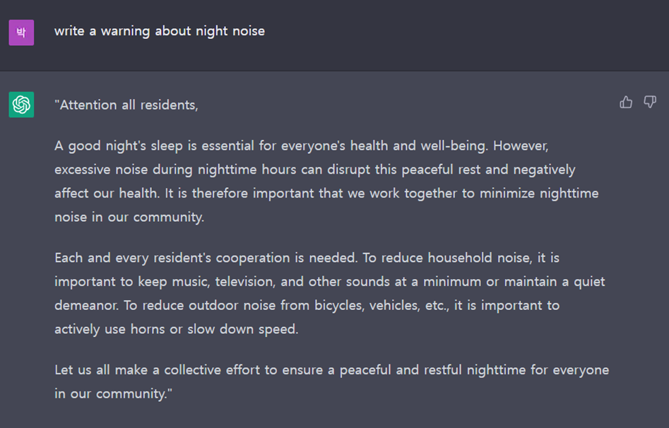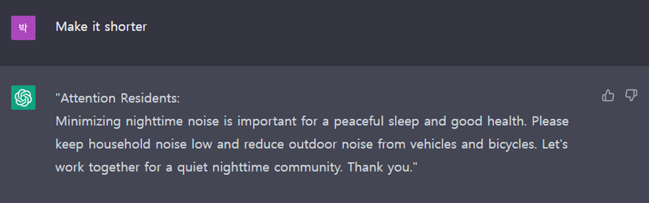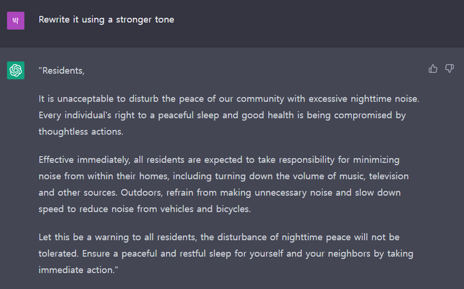 다음으로는 ChatGPT의 follow-up correction 기능을 테스트해보기 위해 야간 소음에 대한 경고문을 작성해달라고 요청하였다. 그 후, 해당 경고문을 좀 더 짧게 작성해달라고 하였고 마지막으로 좀 더 강한 어조로 작성해달라고 순차적으로 요청하였다. 아래는 그 결과이다.