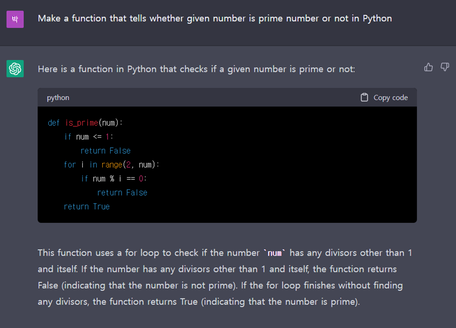 Examples에 마지막으로 소개된 기능은 nocode AI 기능이다. ChatGPT에게 주어진 숫자가 소수인지를 판별하는 함수를 파이썬으로 짜달라고 해보았다.