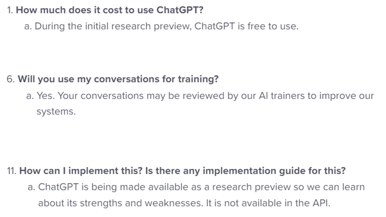 위 사진은 OpenAI 홈페이지에 올라온 ChatGPT와 관련된 FAQ의 일부를 발췌한 것이다. ChatGPT는 현재 OpenAI 홈페이지에서 무료로 사용이 가능하다. FAQ 1번을 보면 initial research preview 기간 동안 무료로 사용이 가능하다고 한다. 알파고 급의 AI 쇼크에 현재 이용자수가 폭증하고 있다고 하는데 조만간 유료로 전환될 것 같다(이미 전환 얘기가 나오기도 했지만). ChatGPT 모델 크기도 매우 큰데 이를 이용해 inference를 돌려 response를 생성하는데에도 어마어마한 computing cost가 들 것이다. 이를 기업이 그냥 모두에게 언제까지고 개방해둘리가 없다...