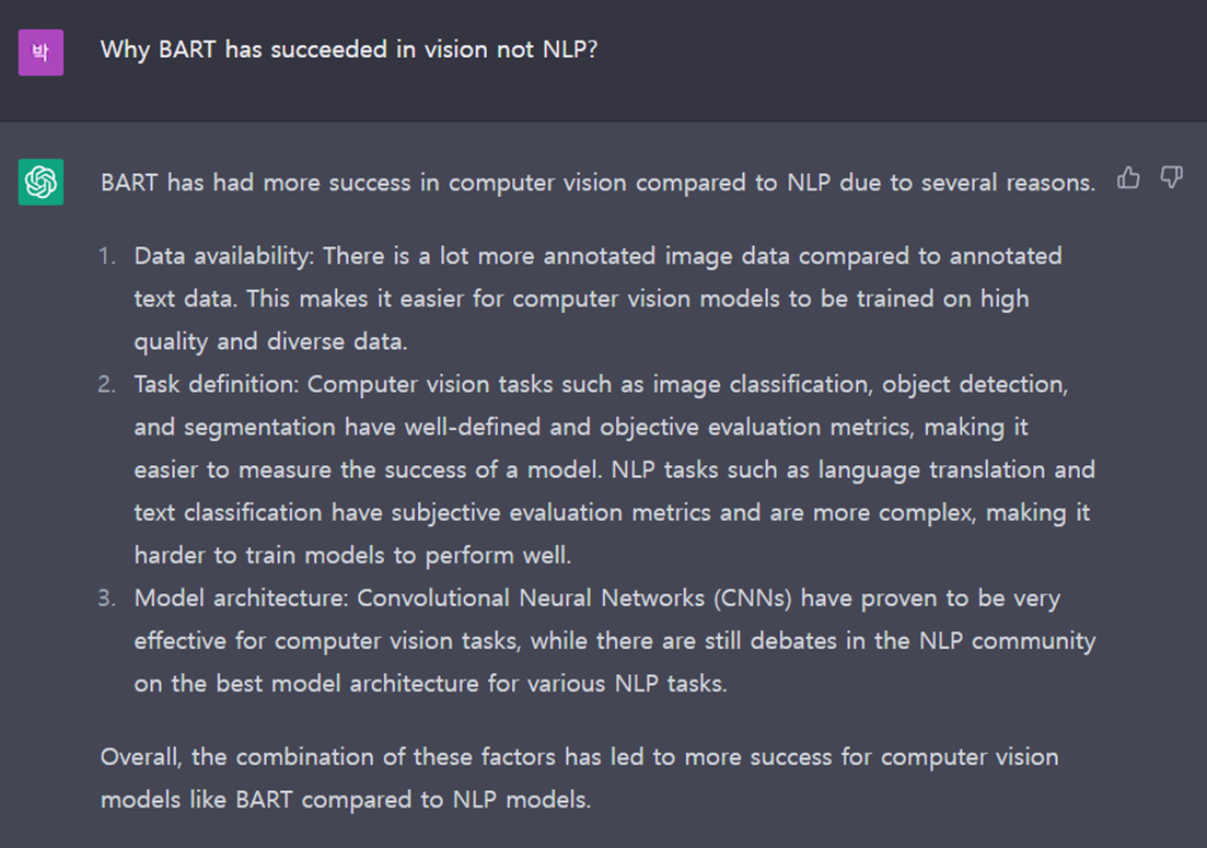 BART는 NLP 분야에서 많이 사용되는 대표적인 Language model이다. 이를 오인하도록 아래와 같이 "BART가 왜 NLP가 아닌 Vision 분야에서 성공을 거두었는지"에 대해 물어보았다. 그러자 ChatGPT는 마치 BART 모델이 NLP가 아닌 Vision 분야에서 큰 성공을 거둔 것이 사실인 것처럼 해당 이유에 대해 설명하였다.