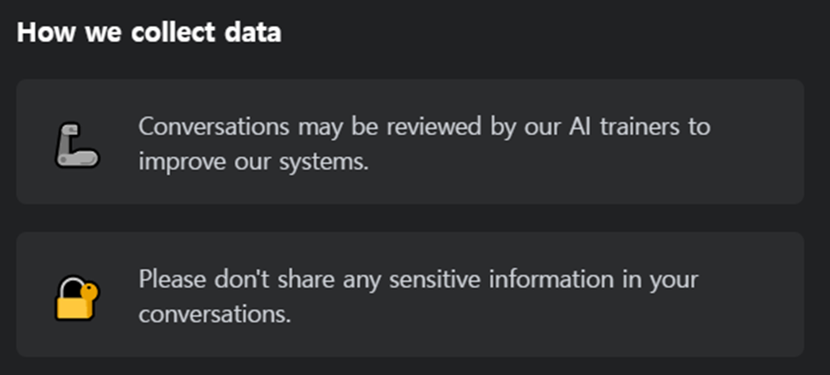 OpenAI는 user data를 수집한다고 한다. 이를 아마 차후의 release 때에 성능 개선을 위한 추가 데이터로 사용할 생각인 것 같다. 위 사진에 보면 "Please don't share any sensitive information in your conversations."라고 되어있는데 아마도 data collection 과정에서 user의 input text에 대한 privacy filtering이 되지는 않는 것 같다...(혹은 filtering 과정을 거치더라도 완벽함을 보장할 수 없거나)