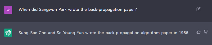 추가적으로 이제는 모든딥러닝 분야에서 사용 중인 back-propagation 논문을 내가 언제 작성했는지 물어보았다. 그랬더니 아래와 같이 답변해주었다. 하지만...나는 물론이고, Sung-Bae Cho와 Se-Young Yun은(누군진 모르겠지만) back-propagation paper를 작성한 사람들이 아니다...몇 가지 질문을 던져본 결과, ChatGPT는 false prompt에 약한 듯하다. 사용자가 input으로 주는 질문에 대해 어느 정도 True라고 사실관계를 생각하고 답변을 생성하는 것 같다.