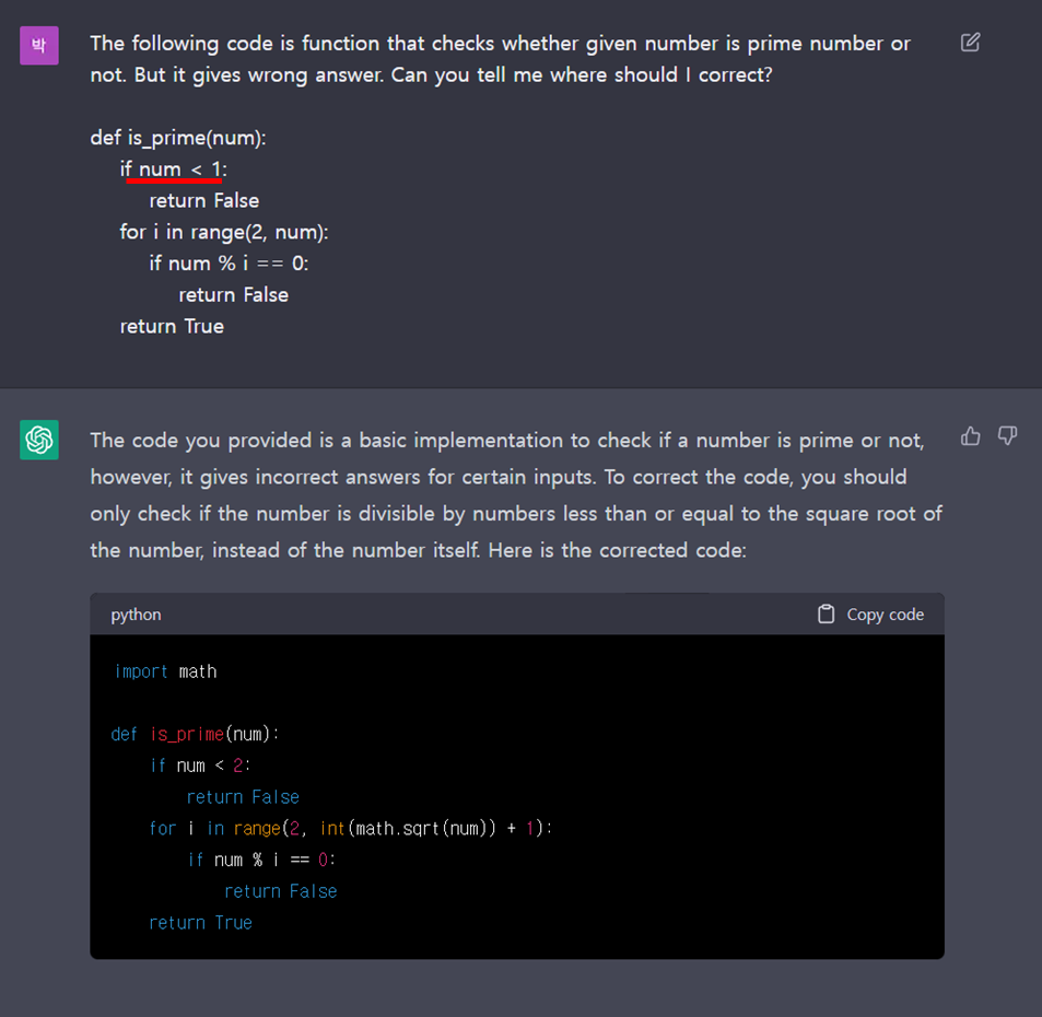 공식 문서에는 해당 코드, 코드에 대한 설명 그리고 에러에 대한 설명을 함께 input으로 제공하면 debugging 기능도 수행할 수 있다고 한다. 그래서 위 코드에서 빨간 밑줄 부분을 바꾸어서 일부러 잘못된 코드(자연수 1은 소수가 아님에도 아래 코드는 1에 대해 True를 return하므로)를 만든 뒤 수정해달라고 요청해보았다.