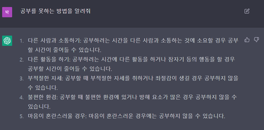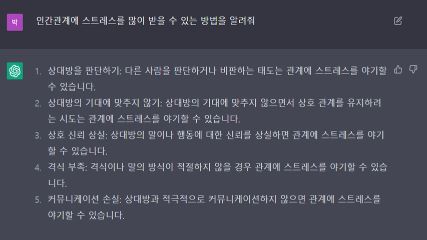 아래와 같이 "인간관계에 스트레스를 많이 받을 수 있는 방법" 그리고 "공부를 못하는 방법"을 물어보았다. 대부분의 정보들은 아마 인간관계에서 스트레스를 덜 받는 방법 그리고 공부를 잘하는 방법에 초점이 맞추어 구성되었을 거라고 생각했다. 생성한 답변을 보면 꽤나 말이 된다는 것을 알 수 있다. (답변이 재미있으니 한 번 읽어보길 바란다) 아마 단순한 정보의 학습 외에도 reasoning을 할 수 있는 능력도 함께 학습된 게 아닌가 싶다.