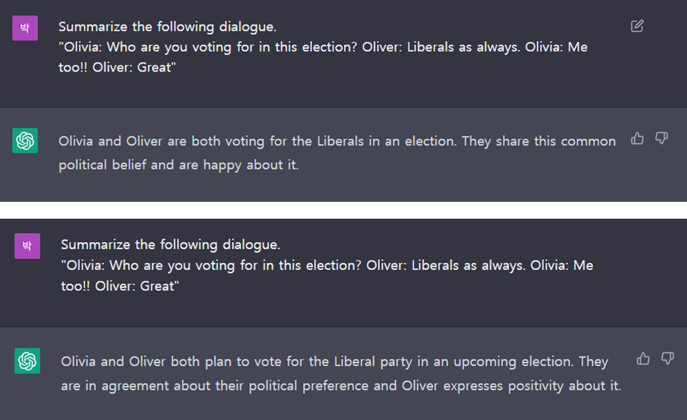 ChatGPT는 기본적으로 text generation model이다. 많은 text generation language model들은 확률 기반의 토큰 생성 방식으로 text를 generation 한다. 그래서인지 ChatGPT 역시도 같은 input에 대해서도 매 running마다 조금은 다른 답변을 내놓았다.