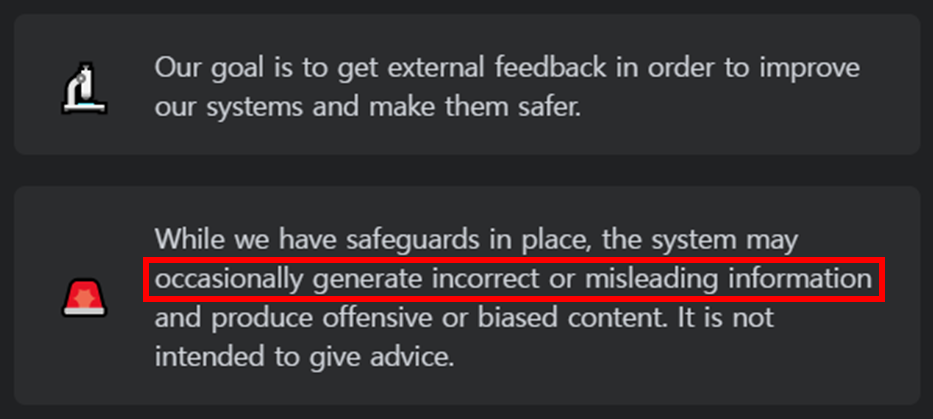 아래는 홈페이지에 공개된 ChatGPT와 관련된 소개이다. "occasionally generate incorrect or misleading information"이라고 되어있는데, 때때로 틀린(사실과 다른) 혹은 오해의 소지가 있는 정보를 제공하기도 한다고 소개하고 있다. 이는 뒤에서 한계점을 설명할 때 더 자세히 언급하겠다.