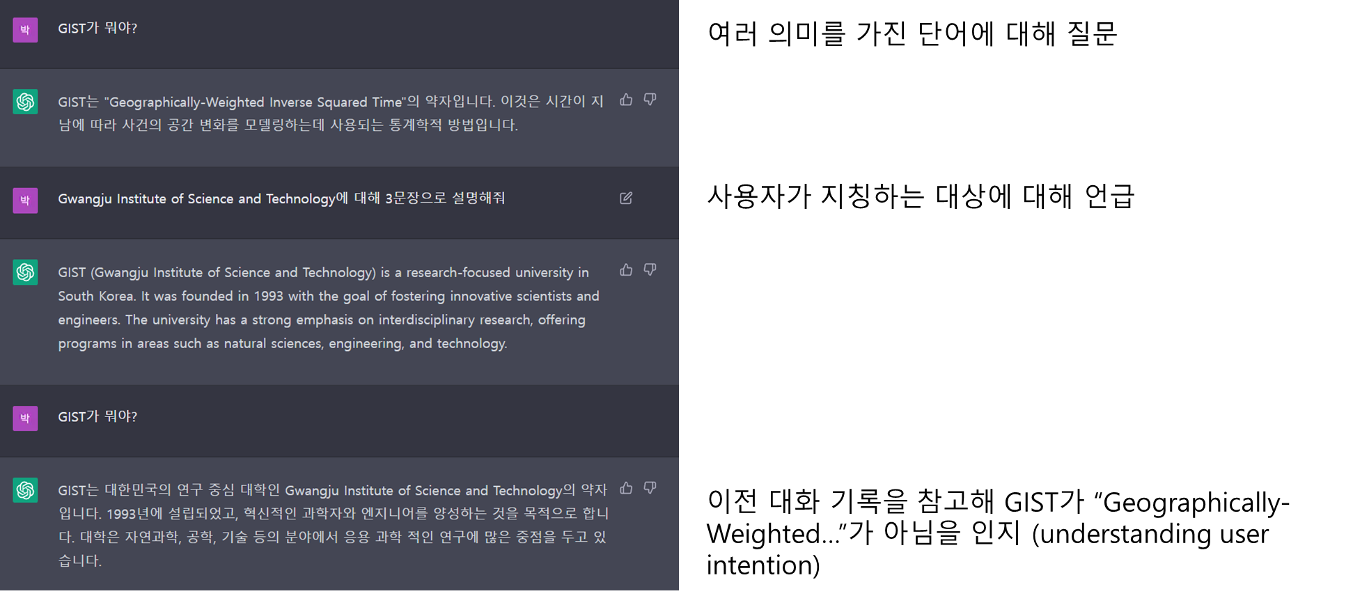 일부러 여러 의미를 가진 단어를 선택해 물어보았다. GIST는 위장관 기질종양, geographically-weighted inverse squared time, 어떤 말이나 글의 핵심 그리고 마지막으로 내가 다니고 있는 광주과학기술원 등과 같이 여러 의미를 갖고 있다. 아마 ChatGPT가 처음에는 이러한 것을 구분하지 못할거라고 생각해서 해당 단어에 대해 물어보았다. 그리고 다음 질문으로 내가 의도하는 광주과학기술원에 대해 설명해달라고 하였고, 그 다음으로 GIST에 대해 다시 물어보았다. 결과적으로 ChatGPT는 이전 대화 기록을 기억해 사용자가 의도하는 GIST가 광주과학기술원임을 인지하고 이에 대해 설명해주었다.
