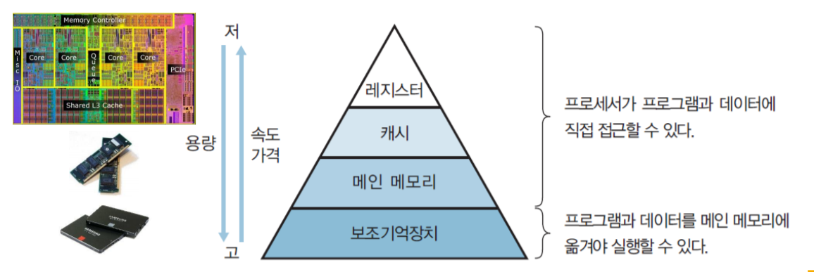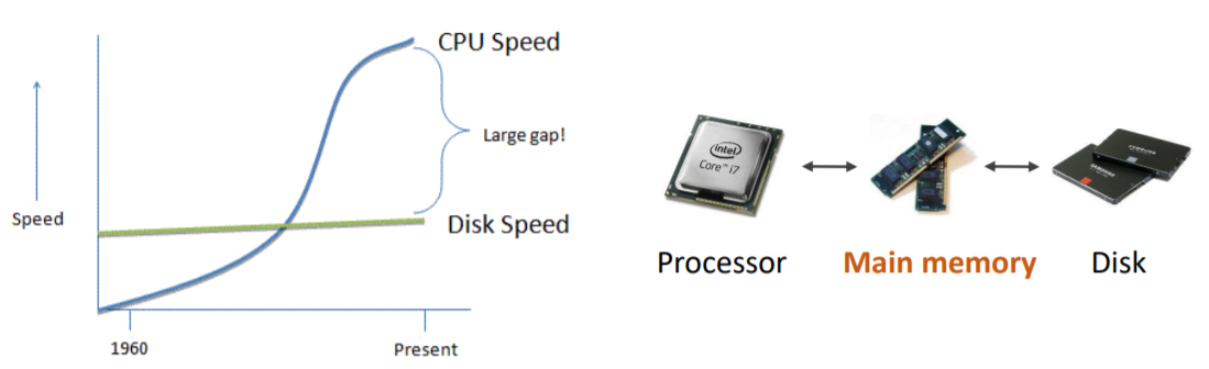 => 시간의 흐름에 따른 Disk와 CPU의 speed 발전에 large gap 존재. 이를 해소하기 위해 Disk보다 용량 작 고, 스피드 빠른 메인메모리 도입